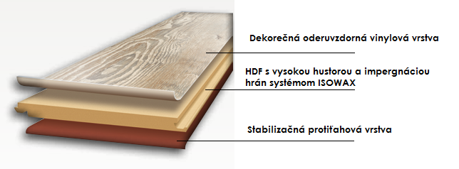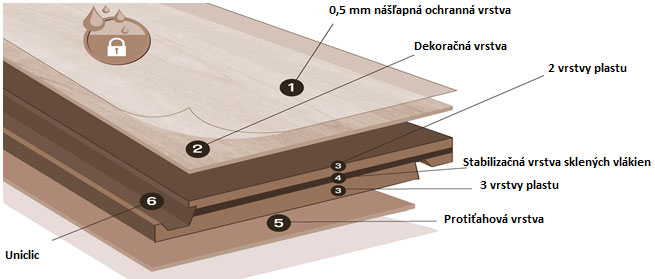 Vrstvené zloženie tejto podlahovej technológie spája silné stránky dreva, papiera a živice. Odolná krycia vrstva je na povrchu. Chráni obraz dekoru, ktorý je buď vytlačený na papier, alebo priamo na dosku HDF. Aby sa zabránilo deformácii, na zadnú stranu